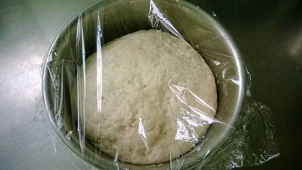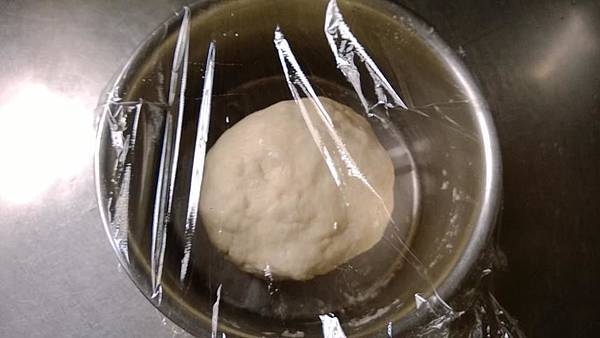 (2) 將麵糰放入鋼盆中,撒些水,用保鮮膜或溼布蓋上靜置,發酵1至2小時至麵糰變兩倍大(室溫越高發酵時間越短,宝溫越低發酵時間越長)。