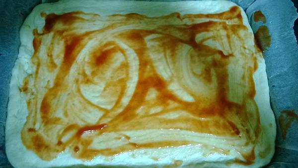 (2) 在餅皮上抹蕃茄醬(不要抹太多,因泡菜也很溼,太溼會影響成品口感), 喜歡鹹一點的人可撒上鹽和蕃茄醬一起抹勻。