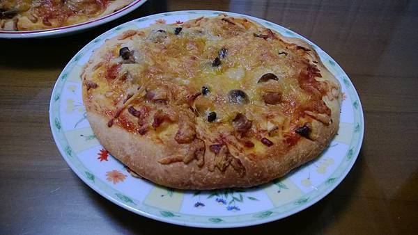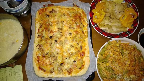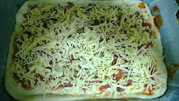 (1) 將所有比薩餅皮的材料倒入一鋼盆中混合搓揉成麵糰,若太乾無法成糰,再酌量加水至可搓揉成光滑不黏手的麵糰。