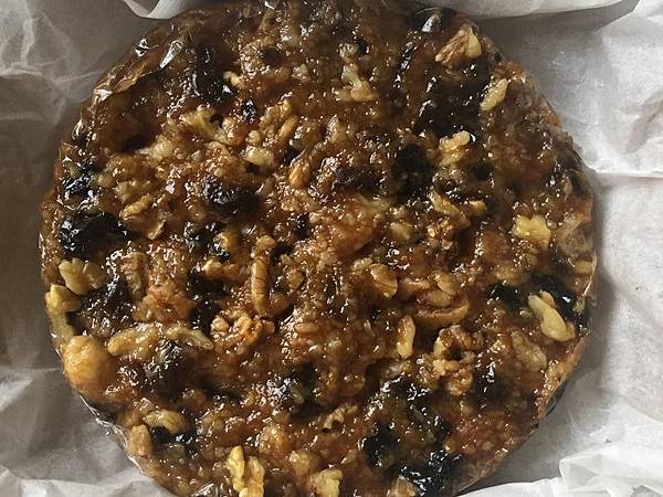 (4) 取一個8吋圓形模型或二個6吋圓形模型,鋪上玻璃紙(吹粿紙),將尚未冷卻的桂圓核桃糯米糰倒入鋪平(若用手整平,手沾溼較不易黏手),靜置冷卻後即可食用。